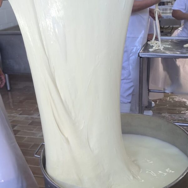 Após a separação do sólido e do soro, deixamos a massa descansar e fermentar por pelo menos 16 horas, até atingir o ponto ideal para a filagem, quando se transforma em mussarela e ganha forma.