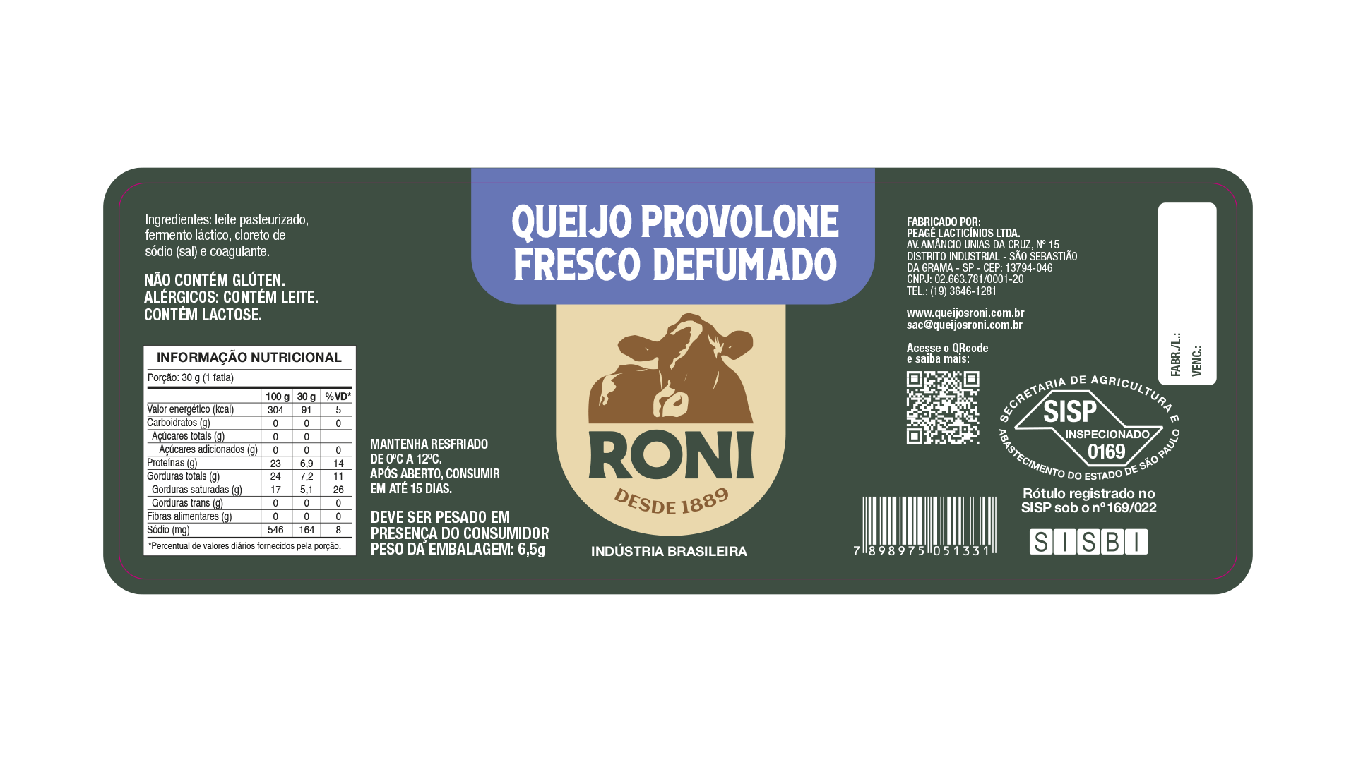 São características do Provolone RONI não ter um forte sabor de defumação e não ser muito salgado. Mantemos a mesma receita há décadas e sua defumação é natural, sem produtos químicos.